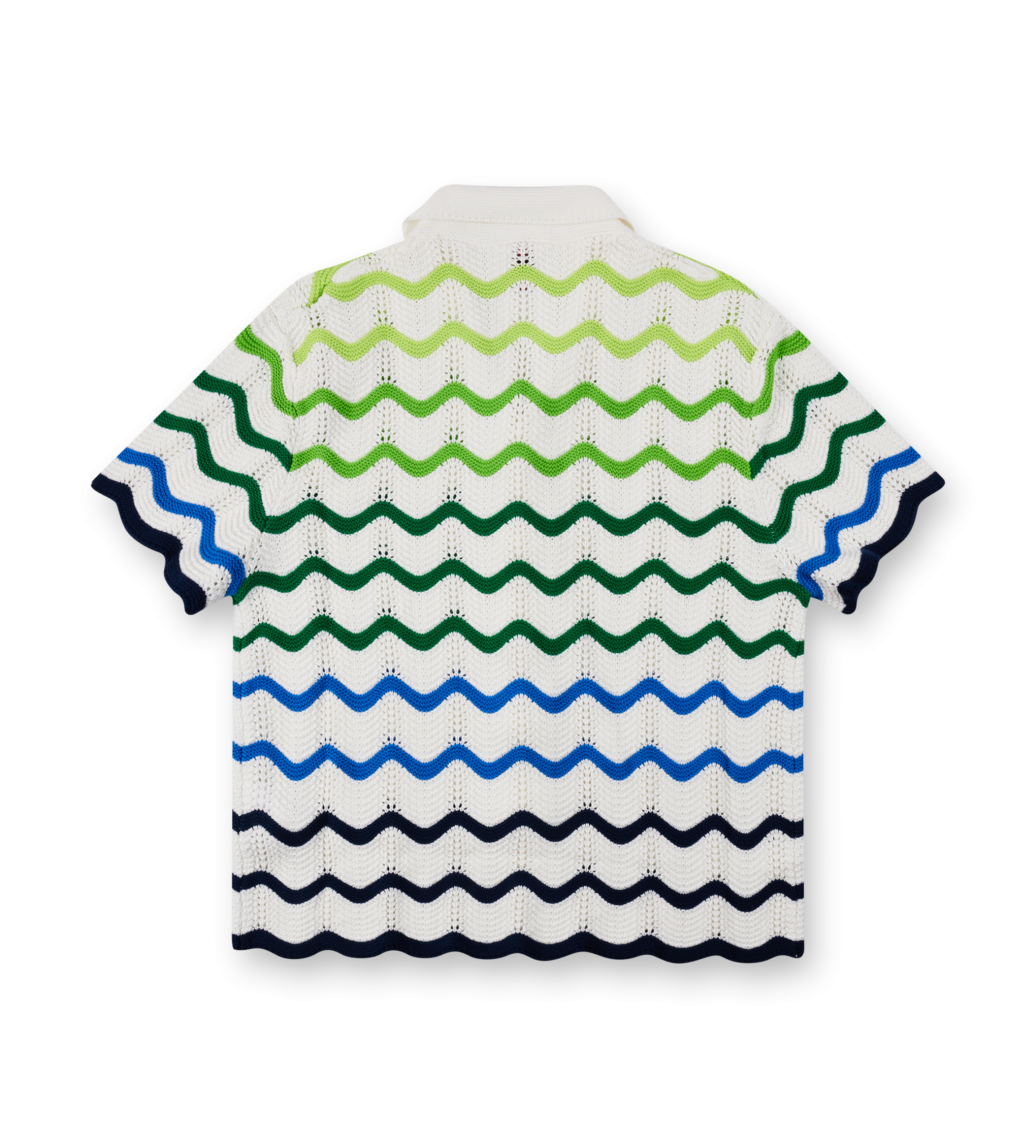 Casablanca Wave Knitted Shirt – White/Green The Wave Knitted Shirt expresses Casablanca’s refined resort aesthetic through an open-weave crochet construction and a soft seasonal gradient. Crafted from cotton with a textured, airy feel, the design features a Cuban collar and short sleeves for a relaxed silhouette, finished with ribbed trims and the house’s signature gold-rim…