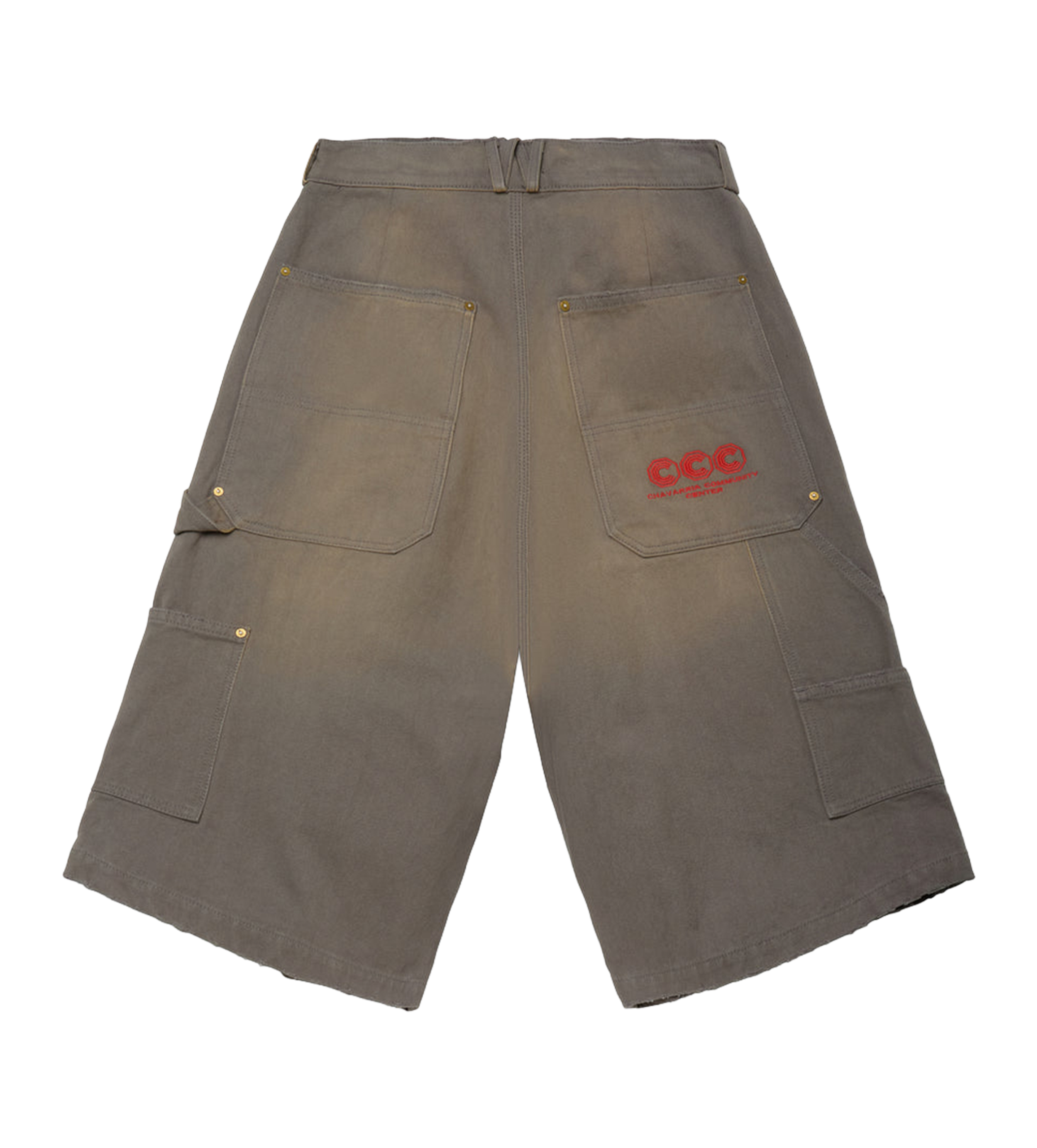 Willy Chavarria Stockton DBL Knee Short – Concrete Willy Chavarria Stockton DBL Knee Short in CNCRT is a heavy-duty cotton workwear short with a wide, relaxed silhouette. Designed with reinforced double knee panels and multiple utility pockets, the piece is finished with metal rivet reinforcement and CCC Chavarria Community Center branding at the back pocket….