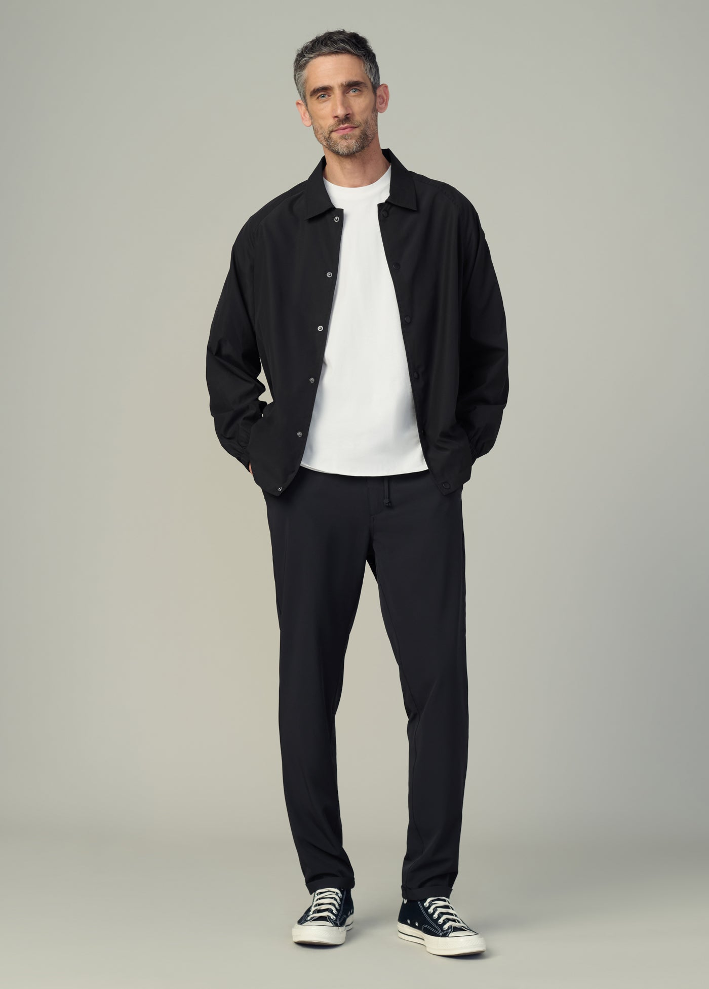 A coaches jacket made from lightweight nylon. DETAILS + FIT Front snap button closures 2 side welt pockets Bungee adjusters at hem Interior pocket Raglan sleeves 100% lightweight nylon. Gabriel is 6’2” and is wearing a size MWaist: 32” Chest: 39” Inseam: 34”