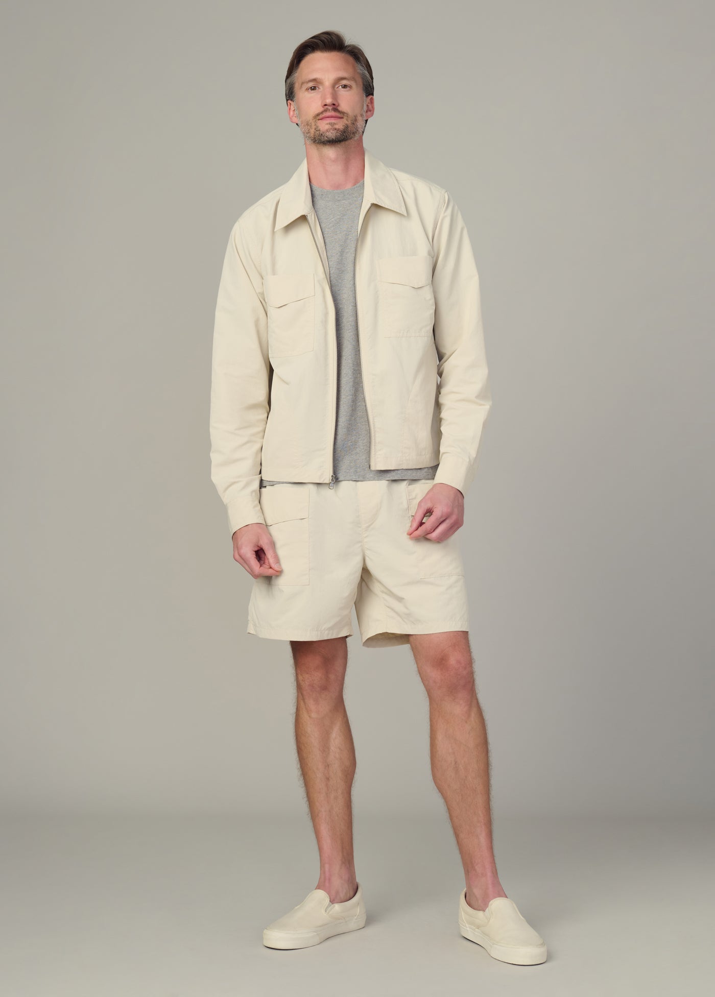 A super lightweight nylon shirt jacket. DETAILS + FIT Front zipper closure Point collar Functional chest pockets Button closure at cuff Super lightweight, crinkled 100% nylon. Chris is 6’2” and is wearing a size M.Waist: 31” Chest: 40” Inseam: 32”