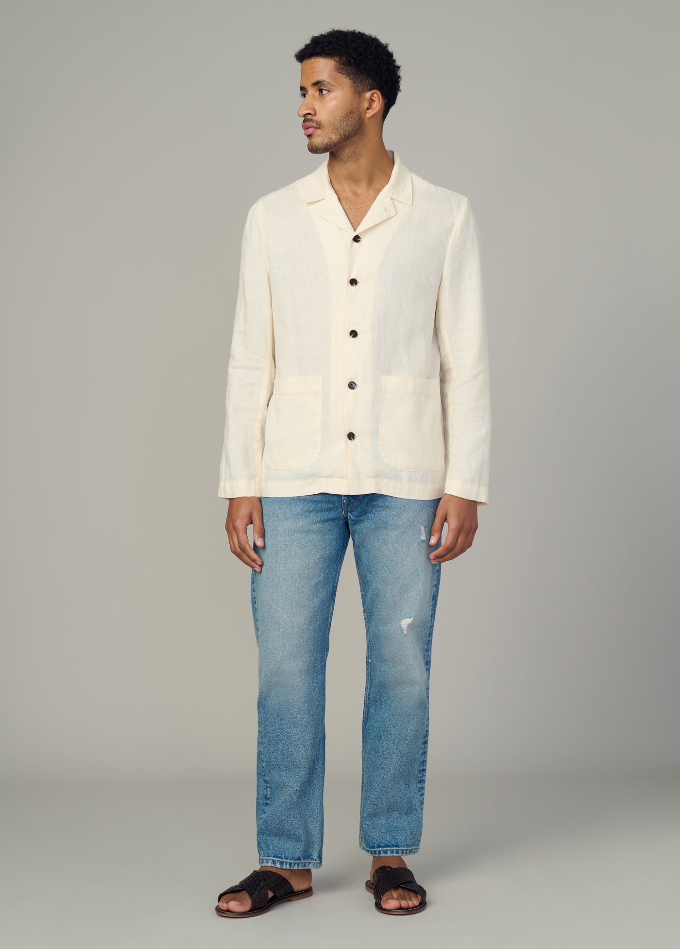 A go-to lightweight and airy blazer that can be worn buttoned up as a shirt or unbuttoned as a blazer. DETAILS + FIT Relaxed fit Notched collar Long sleeves Two front patch pockets Piece dyed for saturated color 100% lightweight linen. Adom is 6’2” and is wearing a size M.Waist: 31.5” Chest: 38” Inseam: 33.5”